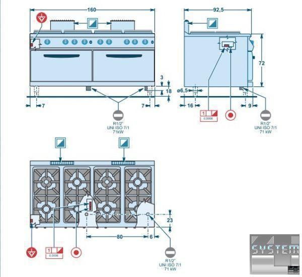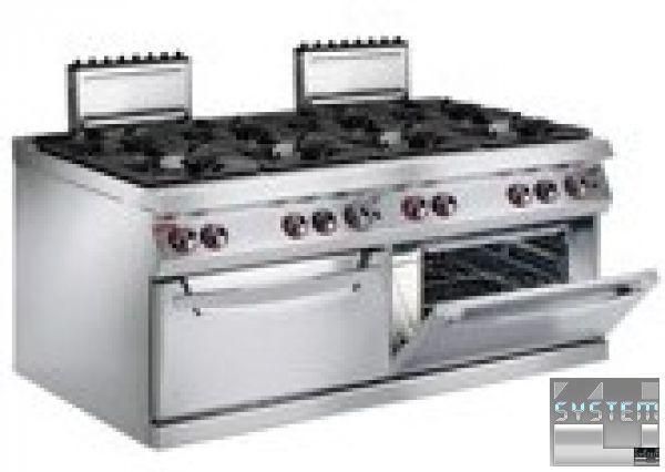 Газовая плита на горелок Angelo Po 391FAG на газовом духовом шкафу относится к тепловой модульной линии Alpha900. Конструкция из нержавеющей стали 18-10, толщиной 20/10 мм. Горелки, крышки горелок и решетки для посуды сделаны из чугуна с полублестящей кислотоустойчивой черной эмалью RAAF. Открытые горелки имеют двойную корону огня, две из них мощностью 4 кВт (80 мм, однорядное пламя), 4 горелки мощностью 7 кВт (диаметр 110 мм) и две мощностью 10 кВт (диаметр 130мм). Термостатический клапан с пилотом, термопарой и пьезоэлектрическим воспламенением. Запатентованная труба Вентури: инновационный образец для максимальной гигиены в сгорании, минимизирующий вредную эмиссию (КО). Высота верхних решеток оптимальна для достаточного притока воздуха к горелкам, даже при использовании больших кастрюль. Компонируется двумя газовыми духовками мощностью 7,5 кВт каждая (2/1 G.N.). Три уровня напрявляющих для гастроемкостей из нержавеющей стали, легко снимаются для очистки. В комплекте хромированная решетка 1х 2/1 GN (для каждой духовки). Контролер температуры приготовления от 80°C до 300°C.