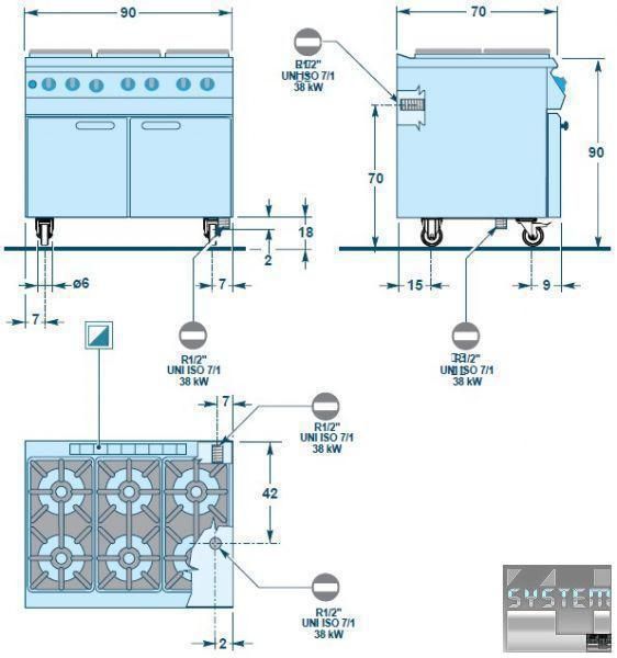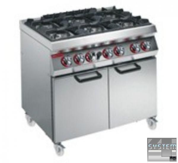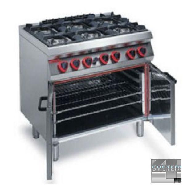 Шесть открытых горелок имеют мощность по 5 кВт каждая (диаметр 105 мм) с одной короной огня, максимальная температура нагрева - 400°C.