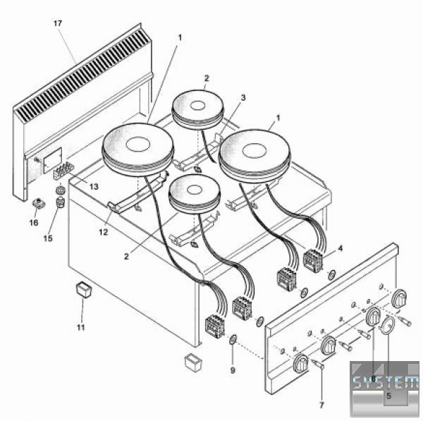 4 конфорки - 2 х 2,6 кВт Ø 220 мм, 2 х 1,5 кВт Ø 180 мм