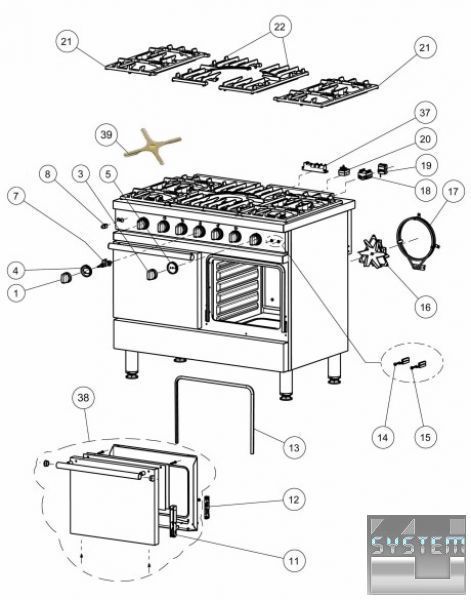 5 конфорок - 1 х 5,0 кВт, 1 х 4,0 кВт, 2 х 3,0 кВт, 1 х 1,5 кВт