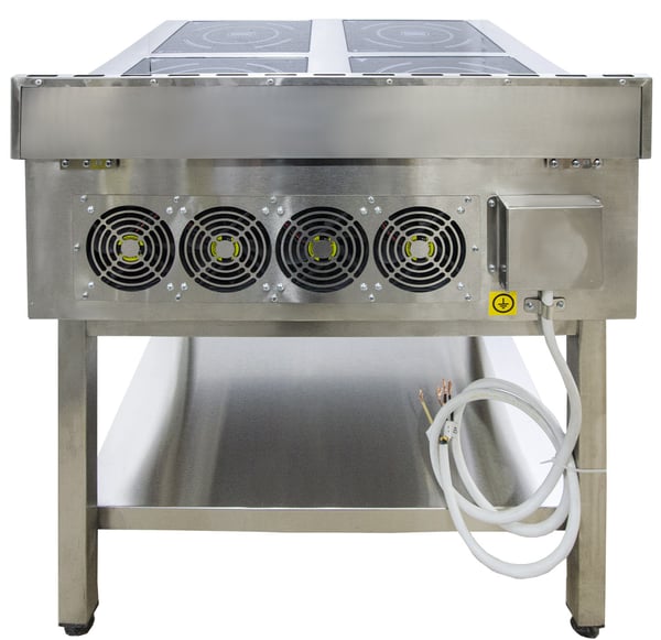 Мощный корпус выполнен из пищевой нержавеющей стали с пристенным бортом для большой многолитражной посуды, которая используется в общепите, а также промышленные индукционные модули со стеклокерамическим покрытием. Внизу есть полка для инвентаря из нержавеющей стали.