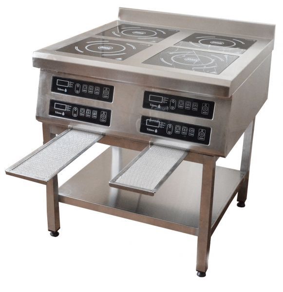 Индукционная напольная плита на 4х3,5 кВт для профессиональной кухни кафе и ресторана, оснащенная энергосберегающей конфоркой и большим удобным в повседневной работе повара сенсорным пультом, который исключает "затекания" и поломку кнопки.