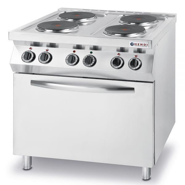 Профессиональная электрическая плита Kitchen Line Hendi, в качестве нижнего модуля, оснащена электрическим конвекционным жарочным шкафом.
