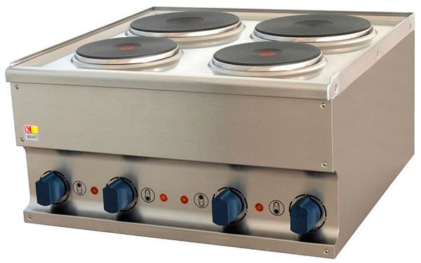 Визуальный контроль работы плиты обеспечивают световые индикаторы. Монтаж выполнен проводом с термостойкой изоляцией. Возможность регулировки по высоте дают ножки-опоры плиты. Обрамление конфорок не имеет щелей и выполнено из цельного нержавеющего листа.
