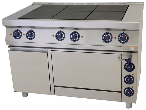 Корпус оборудования выполнен из высококачественной нержавеющей стали, оснащена плита 6 прямоугольными конфорками, которые образовывают ровную поверхность. Округленные грани передней панели отличаются современным дизайном, статическая электрическая духовка, шкаф для хранения инвентаря.