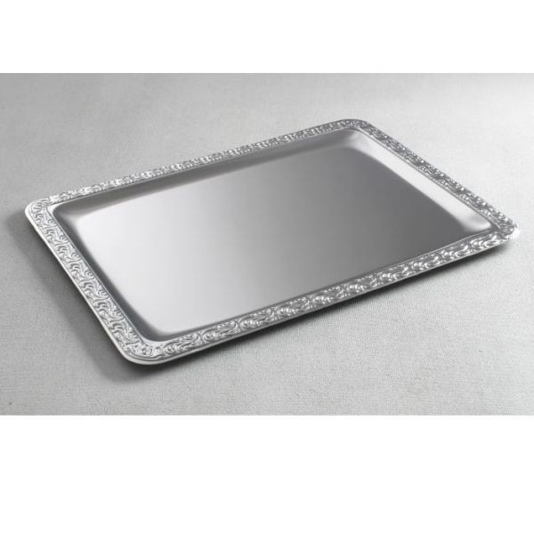 Поднос с декоративным ободком, выполнен из нержавеющей стали. Отполирован, края скругленные.