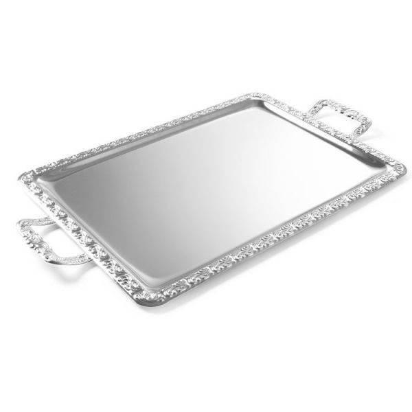 Поднос с ручками, выполнен из нержавеющей стали. Отполирован, имеет декоративный ободок, края скругленные.