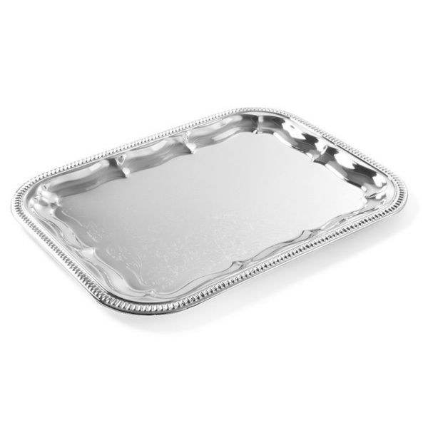 Поднос сервировочный, декоративный, выполнен из нержавеющей стали. Отполирован, прямоугольной формы со скругленными краями.