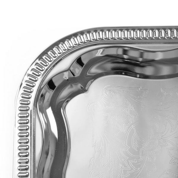 Поднос сервировочный, декоративный, выполнен из нержавеющей стали. Отполирован, прямоугольной формы со скругленными углами.