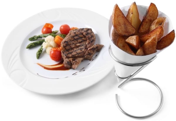 Конусное блюдо идеально подойдет для профессиональной подачи морепродуктов, картофеля фри и жареных овощей.