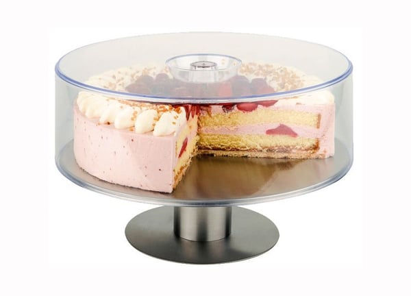 Подставка для тортов выполнена из нержавеющей стали, также на ней предусмотрена кайма под крышку. Подставка расположена на широкой прочной и устойчивой ножке.