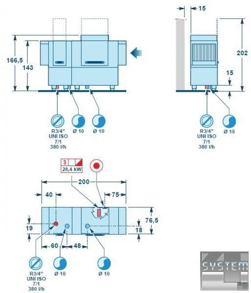 Устройство использует корзины 50 х 50 см. Максимальная рабочая высота моечного туннеля: 45 см. Лучшие результаты получены для воды, имеющей жесткость 8-12 ° F.
