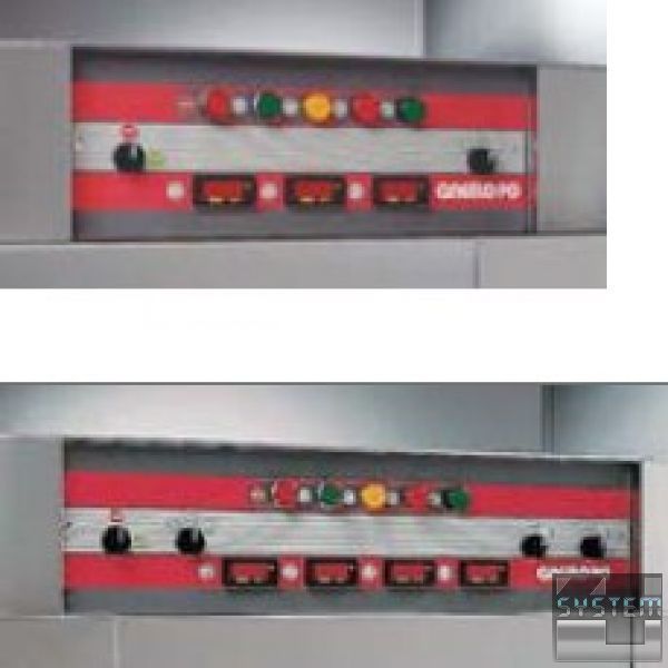 Маловольтажная панель управления в водонепроницаемом корпусе включает: главный выключатель; органы управления движением корзины; индикаторы работы, сигнальные индикаторы нарушений работы, цифровые термометры для контроля температуры воды, кнопка безопасности для остановки машины. Контакторы, тепловые реле и магнитно-термические выключатели легко доступны из панели управления.