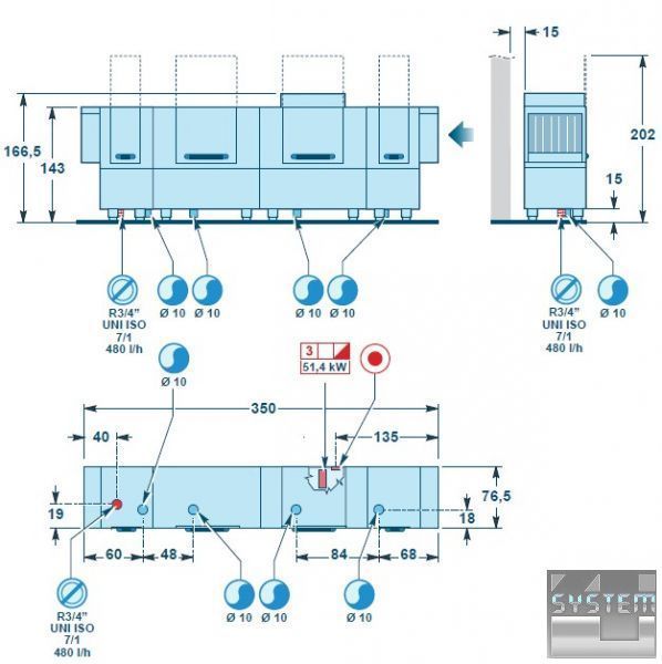 Устройство использует корзины 50 х 50 см. Максимальная рабочая высота моечного туннеля: 45 см. Лучшие результаты получены для воды, имеющей жесткость 8-12 ° F.