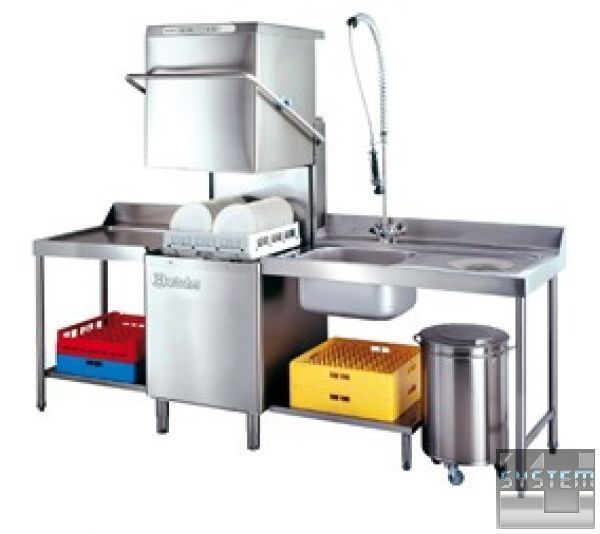 Машина посудомоечная предназначена для мытья глубоких и мелких тарелок, стаканов, столовых приборов в столовых, ресторанах, кафе. Профессиональные посудомоечные машины отличаются от бытовых более коротким циклом мытья (2–3 минуты), наличием бака большой емкости, вода в который поступает при включении машины и используется для мытья на несколько циклов. Таким образом достигается экономия моющего средства и времени.