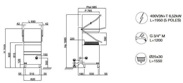 Посудомоечная машина является оптимальным решением для всех потребностей, связанных с мытьем разных типов посуды, в частности, стаканов, тарелок, предметов средних размеров и гастроемкостей GN 1/1 620мм ширины, гарантируя максимальную производительность 60 корзин/час (1080 тарелок/час).