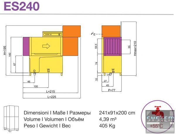 Линейка Evolution Line разработана для больших ресторанов, где требуется непрерывная продолжительная работа посудомоечных машин. Линейка насчитывает 28 моделей тоннельных посудомоечных машин рассчитанных на использование квадратных корзин размером 50х50х13 см. Модели ES55, ES60, ES65 и ES70 имеют ширину 79 см.