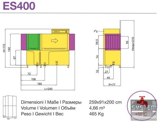 Линейка Evolution Line разработана для больших ресторанов, где требуется непрерывная продолжительная работа посудомоечных машин. Линейка насчитывает 28 моделей тоннельных посудомоечных машин рассчитанных на использование квадратных корзин размером 50х50х13 см. Модели ES55, ES60, ES65 и ES70 имеют ширину 79 см.