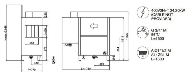 Размеры, в мм: 1750х770х1570, мощность - 28,6 кВт, напряжение-380В.