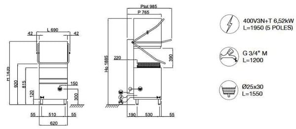 Купольная посудомоечная машина является оптимальным решением для всех потребностей, связанных с мытьем разных типов посуды, в частности, стаканов, тарелок, предметов средних размеров и гастроемкостей GN 1/1 - 620мм ширины, 60 корзин/час (1080 тарелок/час).