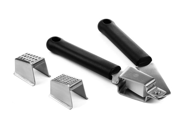 Инструмент для выдавливания чеснока выполнен из высококачественной пищевой нержавеющей стали 18/10, ручки из черного полипропилена.