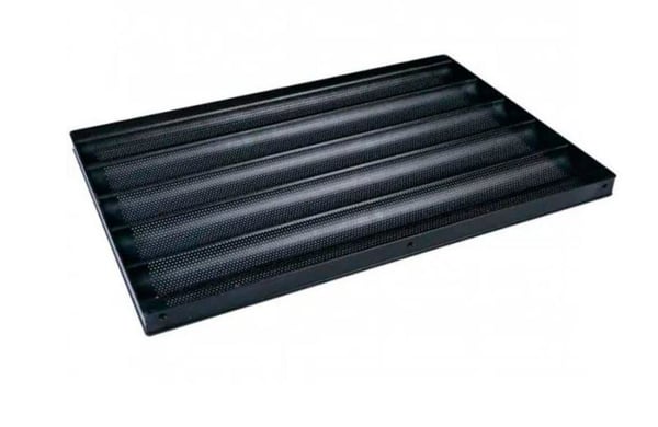 Поверхность рельефного противня имеет 5 углублений для выпечки багетной продукции.