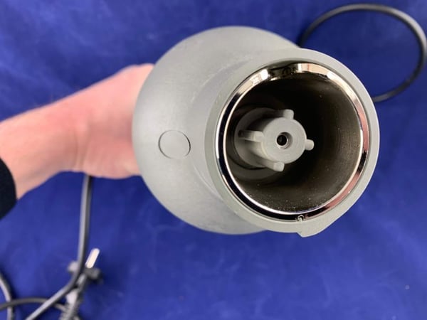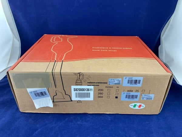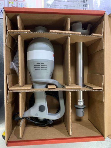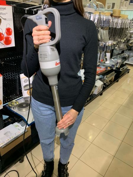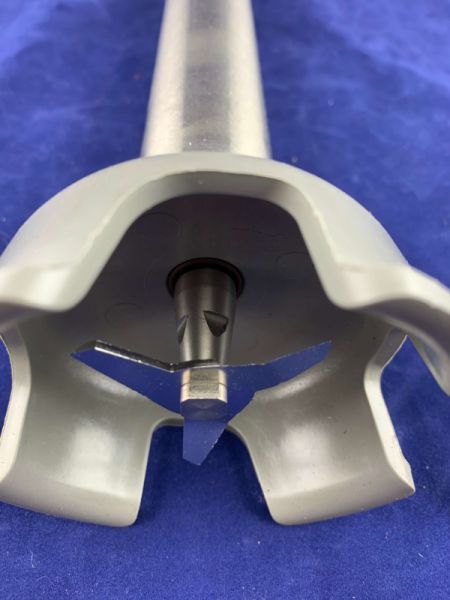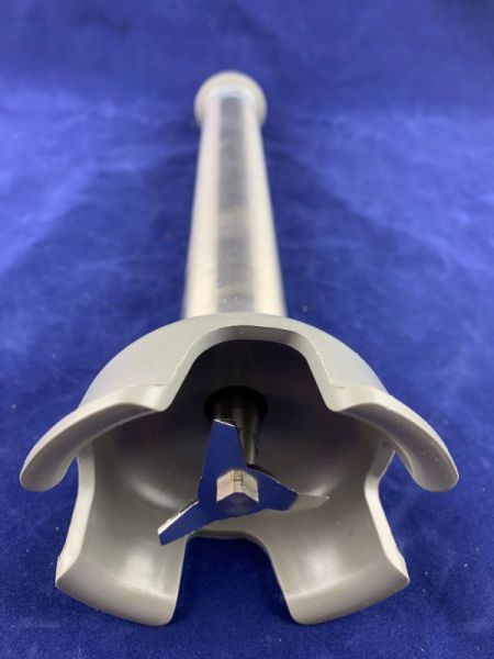 Миксер-мешалка (нога погружная) снабжен защитным колпаком на венчике и защитным колпаком на стержне. Передатчик вращательного движения встроенный в ствол двигателя. Минимальный уровень жидкости указан на самом стержне.