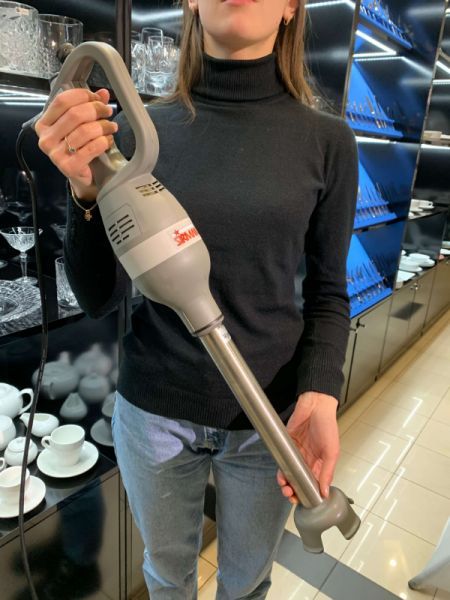 Профессиональный ручной блендер измельчает и перемешивает, делает соусы и пасты, эмульсии, фруктовые и овощные пюре (кроме картофельного), джемы, муссы, протертые супы, печеночные паштеты, тесто для блинов. Особенностью этого прибора является модель двигателя Variotronic, позволяющая фиксировать и регулировать скорость вращения со стабилизацией.