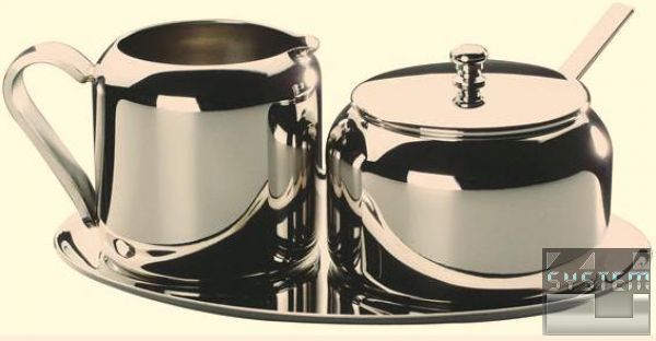 Сахарница и молочник на подносе предназначены для сервировки стола и относятся к бюджетному сегменту профессиональных столовых приборов для ресторанов.