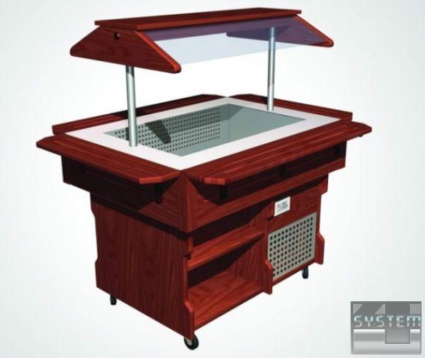 Салат-бары. Организация питания по типу «шведского стола» прочно вошла в нашу жизнь. Такая форма подачи блюд считается одной из самых удобных и выгодных, поскольку у посетителей появляется возможность быстро пообедать, знакомясь со всем ассортиментом представленных блюд наглядно и определяя количество и сочетание ингредиентов на свое усмотрение. К тому же «шведский стол», как неотъемлемая часть интерьера, в некоторой степени определяет и сам стиль заведения, привнося большую демократичность в общую атмосферу подчас даже «строгого» заведения. Салат-бары делят на два вида: настольные и напольные. Последние более мобильны, поскольку у них предусмотрены колесики для передвижения.