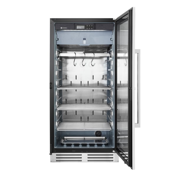 Шкаф для созревания мяса HENDI обеспечивает контролируемую среду для выдержки мяса, что приводит к исключительной нежности и вкусу мяса. Шкаф был разработан для идеального воспроизведения микроклимата, используемого для традиционного природного созревания. В то же время, передовая технология обеспечивает постоянный контроль за процессом, поддерживая постоянную вентиляцию, влажность регулируемого воздуха и стерилизацию. Корпус, дверная рама и ручка изготовлены из нержавеющей стали AISI 304.
