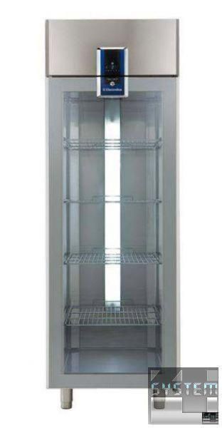 Холодильный шкаф ECOSTORE Premium 727249,однодверный, объёмом 670л., изоляция толщиной 75мм., температурный режим работы +2…+10°С, скрытый испаритель, большой цифровой дисплей, система Frost Watch Control (автоматическое управление оттайкой), цикл турбо-охлаждения (тёплых продуктов), LED подсветка камеры, дверь со стеклянной вставкой с замком и оптическим датчиком, климат класс +32°С, в комплекте с 4 полками GN 2/1 и направляющими, низкий уровень энергопотребления, хладагент R134a, фронтальная влагозащита IPX5, исполнение нерж. сталь AISI 304. Профессиональный холодильник имеет прямоугольную конструкцию с габаритными размерами: 710мм (длина), 837мм (глубина), 2050мм (высота).
