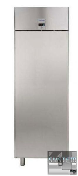 Холодильный шкаф ECOSTORE 727292, однодверный, объёмом 670л., изоляция толщиной 75мм., температурный режим работы 0…+6°С, скрытый испаритель, цифровой дисплей, автоматическая оттайка, дверь с замком и оптическим датчиком, климат класс +43°С, в комплекте с 3 полками GN 2/1 и направляющими, низкий уровень энергопотребления (Class 6), исполнение нерж. сталь. Профессиональный холодильник имеет прямоугольную конструкцию с габаритными размерами: 710мм (длина), 837мм (глубина), 2050мм (высота).