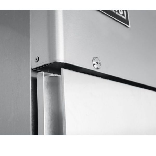 Данный холодильный шкаф изготовлен из высококачественной нержавеющей стали.Внутри камеры располагаются 3 полки, размером GN 2/1, с максимальной нагрузкой на полку до 40 кг.