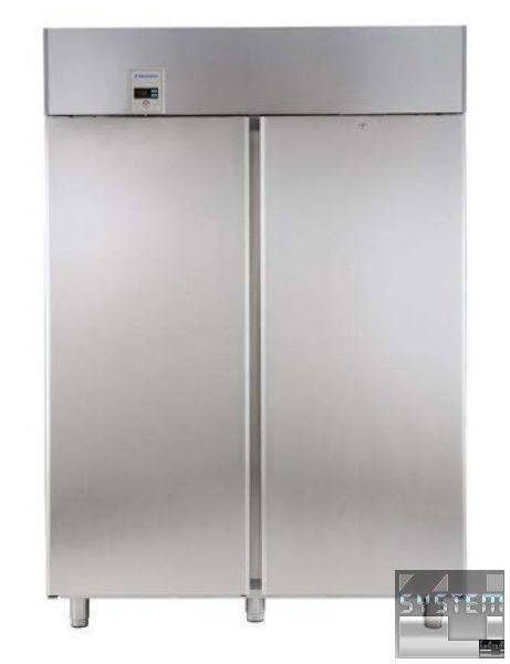 Морозильный шкаф ECOSTORE 727286, двухдверный, объёмом 1430л., изоляция толщиной 75мм., температурный режим работы -22…-15°С, скрытый испаритель, цифровой дисплей, автоматическая оттайка, двери с замком и оптическим датчиком, климат класс +43°С, в комплекте с 6 полками GN 2/1 и направляющими, низкий уровень энергопотребления (Class 6), исполнение нерж. сталь. Профессиональный холодильник имеет прямоугольную конструкцию с габаритными размерами: 1441мм (длина), 837мм (глубина), 2050мм (высота).