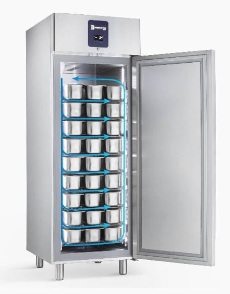 Присутствует рециркулятор/диффузия воздуха, благодаря которой достигается однородность температур, не происходить дегидратация и окисление продуктов. Благодаря рециркулятору холод отводится к стенкам шкафа, избегая прямого воздействия и создавая направленную циркуляцию потока воздуха, который гарантирует хранящимся продуктам уникальную свежесть.