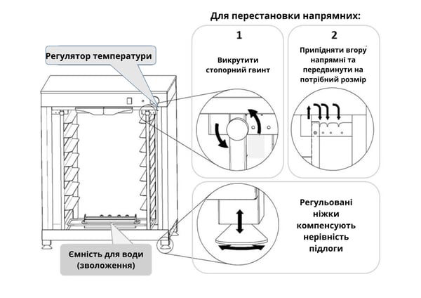 Регулятор температуры позволяет автоматически регулировать и поддерживать заданную температуру шкафа.