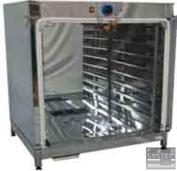 Расстойка - это процесс контролируемого брожения тестовой заготовки перед выпечкой. Выделяющей при этом углекислый газ разрыхляет тесто, увеличивая его объеме в 2-2,5 раза. Расстойка должна проводиться в атмосфере воздуха с температурой в пределах 33-40 градусов и относительной влажностью 75-80%. Расстоечные шкафы предназначены для расстойки как свежесформированых изделий, так и быстрозамороженных полуфабрикатов из дрожжевого теста. Шкаф оснащен системой пароувлажнения и имеет возможность плавного регулирования температуры. В выдвижной поддон в нижней части расстоечного шкафа наливается вода; расположенный внизу ТЭН нагревает воду в поддоне и вызывает ее испарение; таким образом, внутри шкафа образуется влажная и теплая среда, необходимая для расстойки дрожжевых изделий. Расстояние между направляющими 85 мм. Электромеханическое управление. Рабочая температура 30…90°С. Двери из термостойкого стекла.