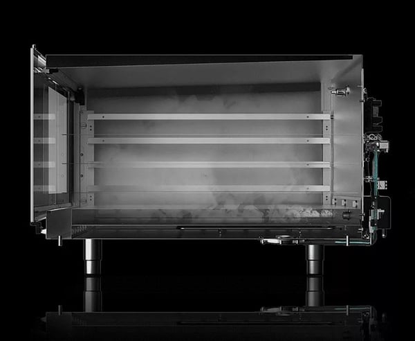 Снизу камеры встроены воздушные трубчатые нагреватели. Оснащен паровым генератором, который находится в промежутках среди направляющих, расстояние между направляющими 75мм.