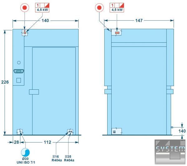 Днище из нержавеющей стали AISI 304 специально спроектировано для выдерживания нагрузки вкатываемой тележки, толщина изоляции 30 мм;
