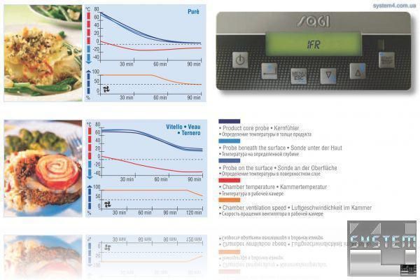 благодаря системе I.F.R., достаточно ввести многопозиционный термокерн в продукт и нажать кнопку пуска цикла интенсивного охлаждения. В зависимости от характеристик продуктов питания, аппарат самостоятельно отрегулирует температуру охлаждения и скорость вентилятора в рабочей камере. С помощью 3 датчиков, расположенных на термокерне, определяется не только температура в толще продукта и на определенной глубине, но и в поверхностном слое обрабатываемого продукта.