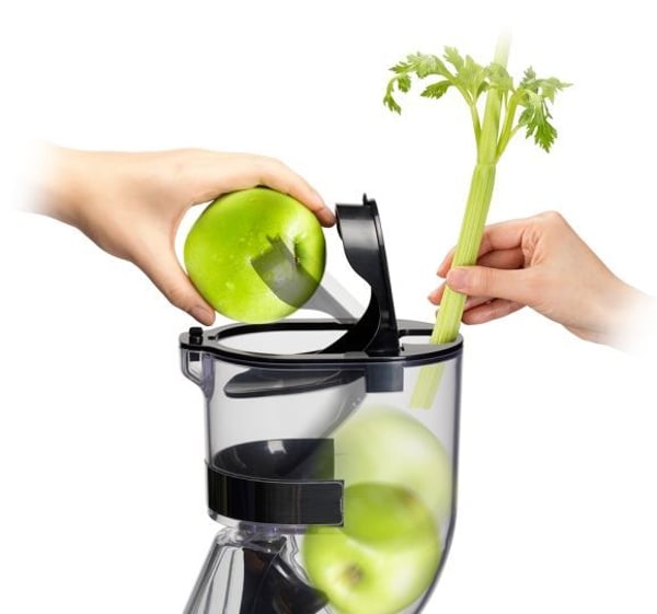 Соковыжималка также имеет аккуратную конструкцию и экономит много пространства на рабочей поверхности. Более того, прозрачный бункер позволяет видеть, как цельное яблоко превращается в сок.