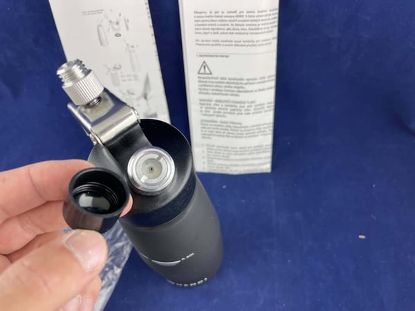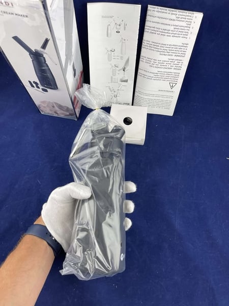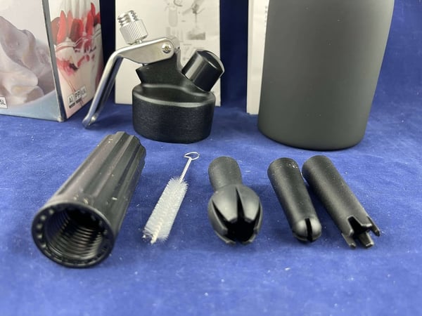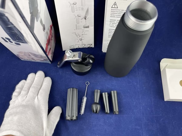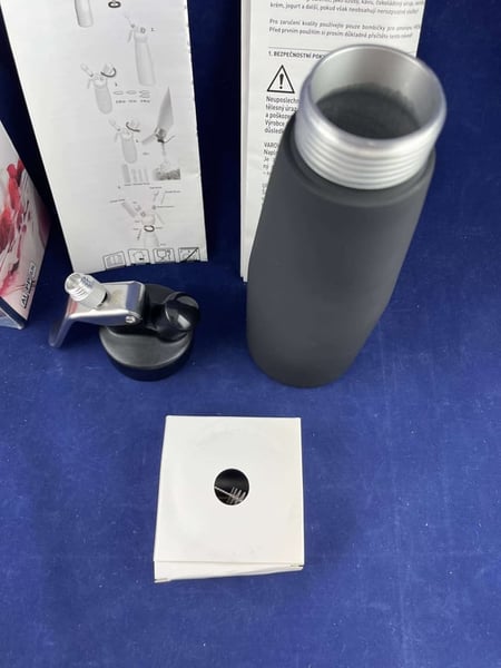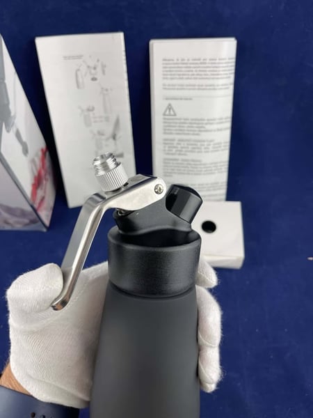 Корпус матового черного сифона для сливок выполнен полностью из алюминия.