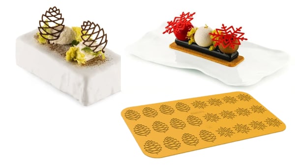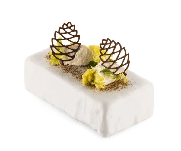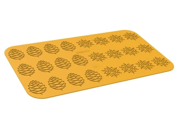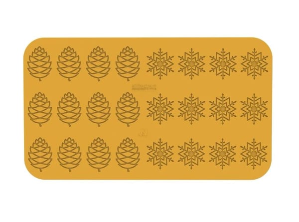 Универсальная силиконовая форма INVERNO от Silikomart используется для создания элегантного декора из узоров миниатюрных кружевных сосновых шишек и снежинок, а также для декорирования первых и вторых блюд, создания оригинальных аперитивов. Форму Inverno также можно использовать в кондитерском производстве для украшения порционных десертов и тортов.
