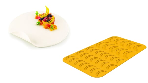 Универсальная силиконовая форма BANANA от Silikomart используется для создания элегантного декора из узоров миниатюрных кружевных бананов, а также для декорирования первых и вторых блюд или создания оригинальных аперитивов. Можно украшать готовые блюда с кремами, муссами, а также овощами, мясом и даже рыбой.