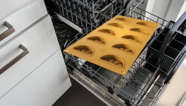 —Удалите излишки теста, почистив поверхность силиконовой формы, чтобы предотвратить разлив. — Выпекайте в предварительно разогретой до 170°C духовке, лучше в духовке с вентилятором (7 минут).