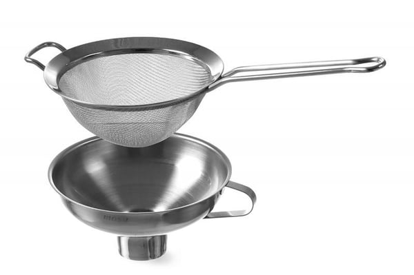В состав набора входят лейка и сито. Лейка идеально подойдет к сифонам для сливок Hendi.
