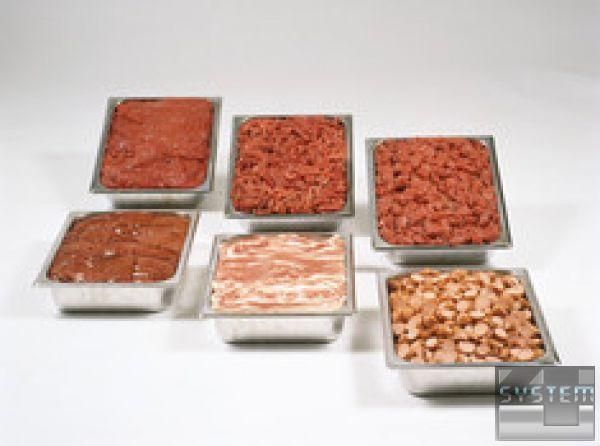Сырье загружается в машину сверху кусками до 1,5 кг. Так как мясо автоматически подается на ножи, то отсутствует опасность травматизма.Нарезанное мясо попадает в расположенный ниже контейнер дляполуфабриката.