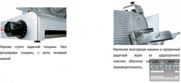 Наклонная конструкция слайсера и прозрачный защитный экран из ударопрочного плаcтика обеспечивает комфорт и высокую производительность гастрономической машины.