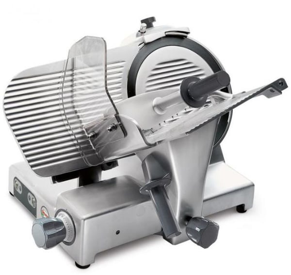 Ломтерезка оснащена прозрачным защитным экраном, выполненым из акрила, который защищает руки работника от режущего диска. Большое расстояние между двигателем и лезвием для более удобной очистки. Возможный демонтаж акрилового кожуха - это способствует удобность при очищении устройства после рабочего процесса.